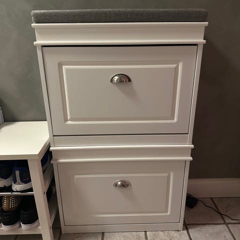 Sælger et IKEA BISSA skoskab med 3 fag i hvid. Perfekt til entréen og en nem måde at få styr på skoene uden at det fylder meget.
