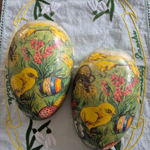 laksefarvet æg som er en anelse lyser i farverne end billederne. Den har en hæklet bort langs kanten. Der er skader på overfladen og mangler en del af sin papirbort indvendigt samt enkelte pletter.