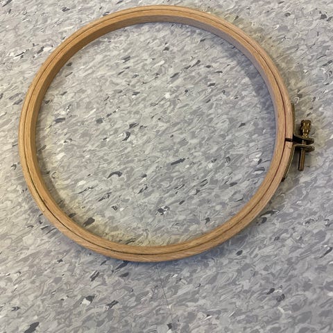 Broderiramme i træ til brug ved broderi og andet håndarbejde. Rammen er rund og har en justerbar spændemekanisme for at holde stoffet stramt under arbejdet.