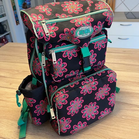 Skoletaskens volumen er 16 liter + 9 liter i gymnastikposen. JEVAs unikke, ergonomiske FOAM-BACK, der sidder perfekt på dit barns ryg.
