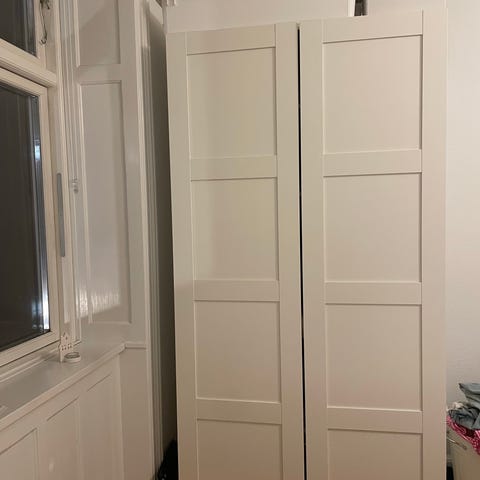 Mørkebrunt træ ikea pax skab, klædeskab, garderobe skab, men skuffer og plads til bøjler. Det ser egentlig rigtig fint ud. Lidt slid her og der. Det står i en lejlighed på 1. Etage.