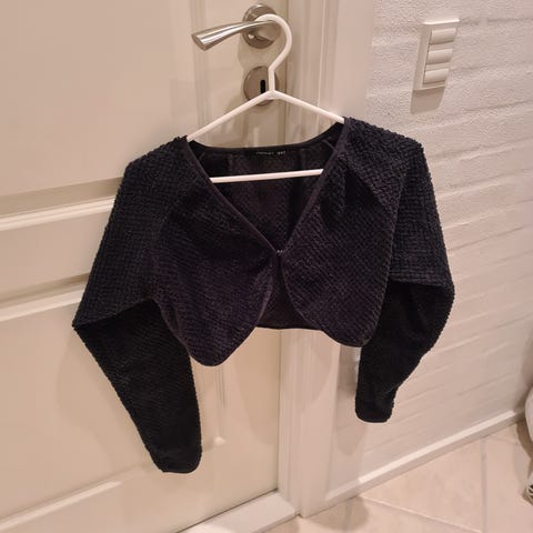 Klassisk bolero jakke i satin med mange fine detaljer på skuldre og ryg.