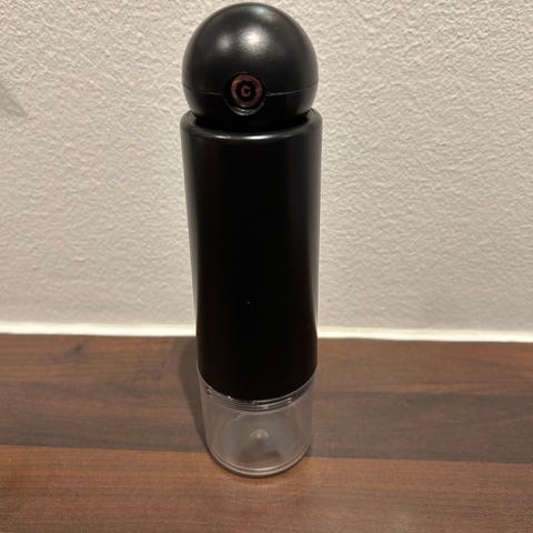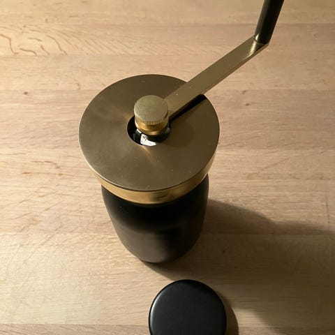 Manuel kaffekværn med sort beholder og håndtag i rustfrit stål. Beholderen kan også bruges til opbevaring af kaffe og leveres med låg. Designet til at male kaffebønner.