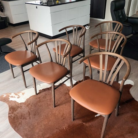 6 mørkbejset egetræstole med cognacfarvet lædersæde fra My Home pæne og uden skader, men desværre er nogen af stolene begyndt at knage, derfor den lave pris.