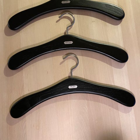 Meget fine bøjler fra Trip Trap. I lyst træ (måske egetræ?) med messing hanke. Brugsspor ses på billederne. 120 kr i stykket, i alt 600 kr.