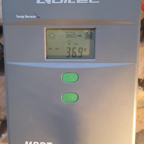 Sunware FOX-220 solcelleregulator med flere tilslutningsmuligheder og indikatorlamper til batteri, solcelle og belastning. Enheden har et robust design med køleprofil og er egnet til styring af solcelleanlæg.