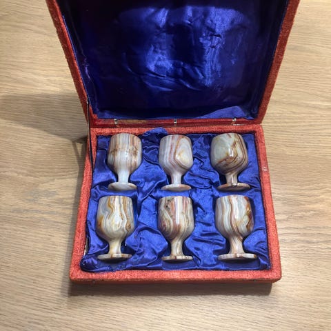 Onyx sæt med kopper, underkopper og kugler i hvid onyx