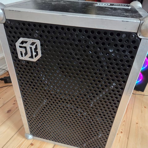Costum build soundboks højtaler. Da det ikke er noget brand er det svært at sige så meget om den men den kan spille ret højt. Der er mulighed for at skrue op på bas og diskant. Kom meget gerne forbi og prøv den. Oplader med følger.