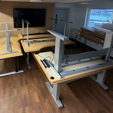 Sælger i alt 12 funktionelle skriveborde med elektrisk højdejustering fra Kinnarps og Labofa.