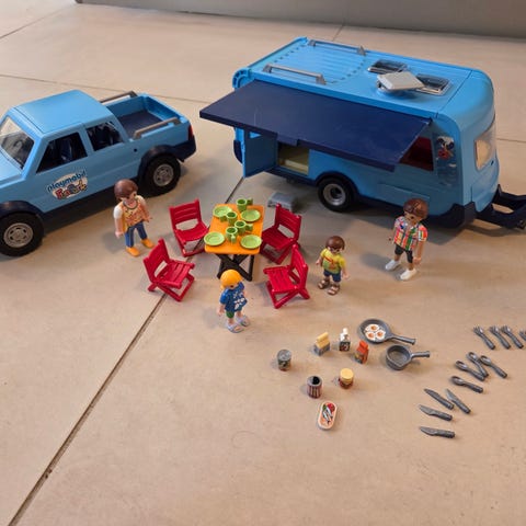 Playmobil legetøjscampingvogn med tilbehør som bord, stole, cykel og figurer. Campingvognen har detaljeret interiør med køkken og siddepladser. Velegnet til børns rolleleg og leg med temaet camping og udendørs aktiviteter. Der ligges en del Playmobil op og der gives rabat ved flere køb. Sender ikke.