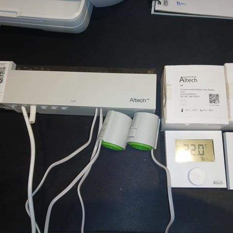 Altech gulvvarmesystem tilbehør inklusive termostater, ventiler, fittings og diverse komponenter til installation og regulering af varmesystemer.
