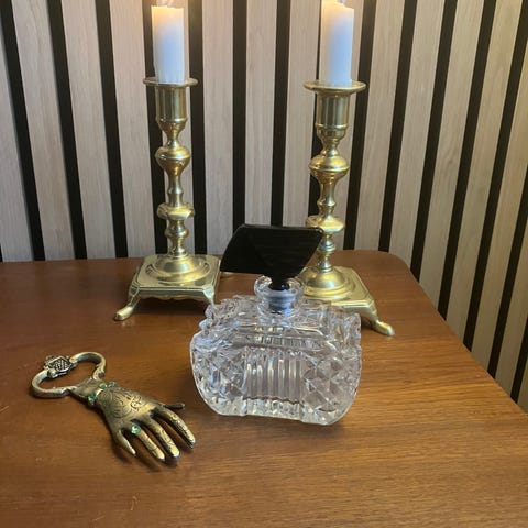 Røgfarvet parfumeflakon i glas fra 1950'erne i art deco stil. Uden afslag eller revner.
