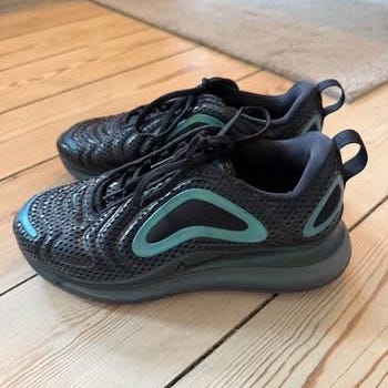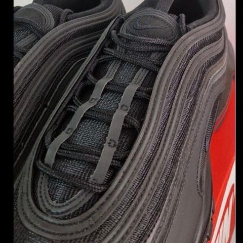 Nike Air Max 97 løbesko i størrelse 36. Skoene er grå med røde detaljer og har en luftpolstret sål for komfort. Designet til løb og sportsbrug.