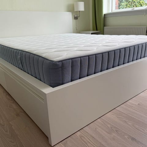 IKEA Malm seng i hvid med målene 180x200 cm. Uden madras. Sengen har en opbevaringsfunktion under madrassen med lamelbunde, hvilket giver ekstra plads til opbevaring. Materialet er primært træ og laminat. Sengen er designet til voksne og passer til standard madrasser i størrelsen 180x200 cm.