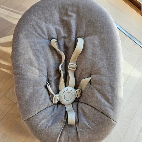 Stokke Nomi - babyindsats med gråt betræk, Har en integreret sele til sikkerhed og komfort. Betrækket er blødt og polstret for ekstra støtte.