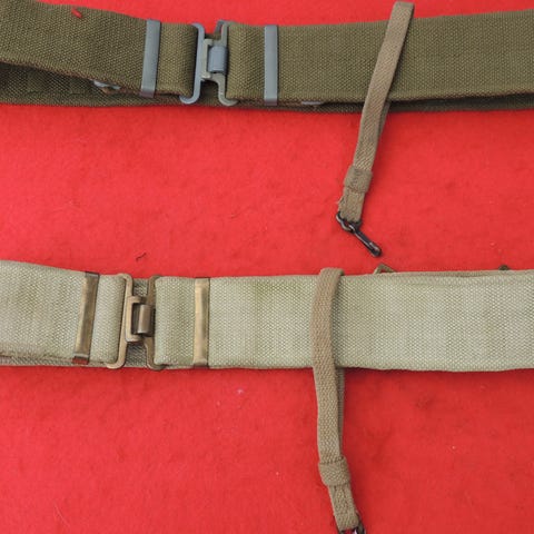 Livrem M/45 i lys khaki webbing med pudsede messingbeslag og påmonteret webbing fangsnor/håndledsrem til pistol som sabelbærerem. Anvendt til parader i feltuniform.