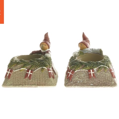 Klareborg juledekoration med lys og nisser. Dekorationen er udformet med en rund form, pyntet med grønne granranker og små danske flag. Indeholder et lys i midten, egnet til julebrug som borddekoration.