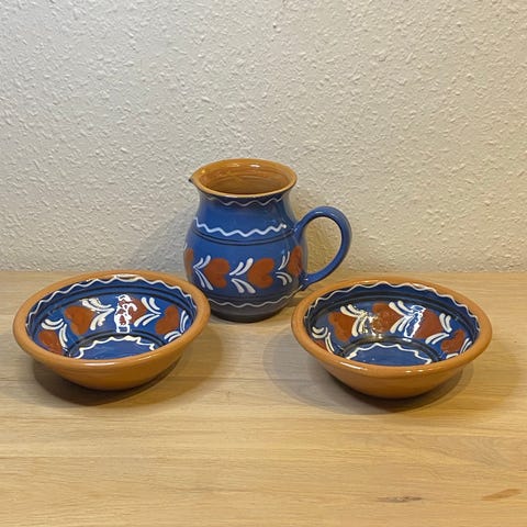 2 af skålene er signeret under bunden, den 3. er ikke - er lidt i tvivl om de er fra samme sted, men de matcher i hvert fald hinanden perfekt. Jeg tror mælkekanden er et andet mærke, den er ikke signeret - men igen den matcher meget fint.