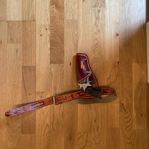Pæn revolver hylster i bælte og 2 tasker (15×14 og 9×9 cm). Alle 3 dele kan sidde på bæltet.