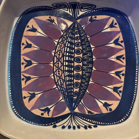 Royal Copenhagen Fajance fad med motiv af en liggende gazelle. Fadet har en orange baggrund med detaljer i sort og guld. Undersiden viser Royal Copenhagens mærke og serienummer. Fadet er fremstillet i fajance og har en rund form.