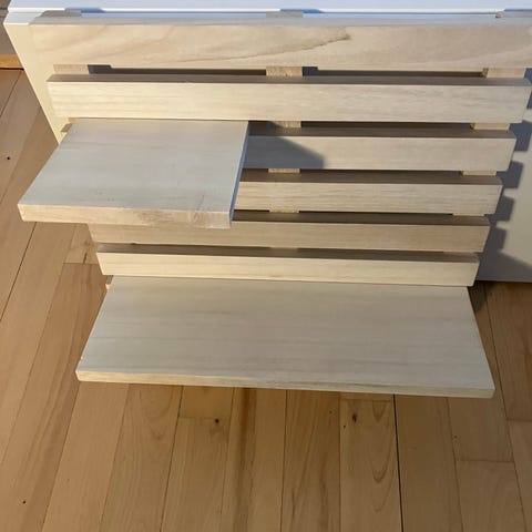 Træ hylde med dekorativt udskåret design, velegnet til ophængning på væggen til opbevaring eller dekoration.