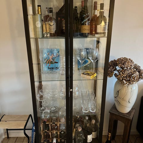 Justerbart hyldesystem, med tre glashylder. Har været brugt som planteskab, men er i pæn stand. Nøglen mangler, men kan let anskaffes hos IKEA efter behov (varenr: 10002394). Originalpris: 2000 kr