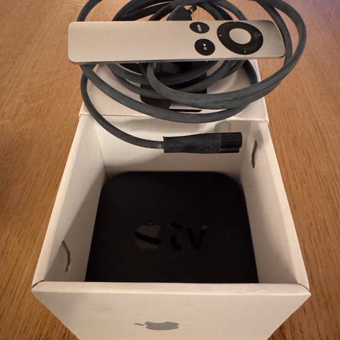 Apple TV streaming-enhed til TV/lyd med fjernbetjening samt strøm-kabel.