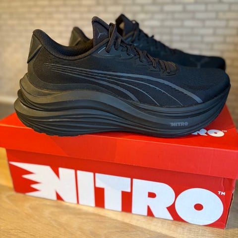 Puma MagMax NITRO løb sko i størrelse 46. Skoene er sorte og designet til løb.