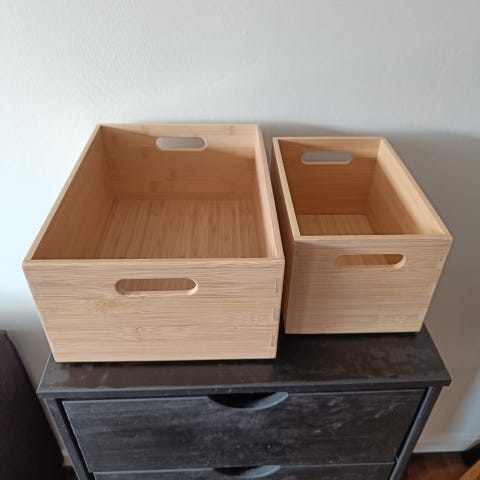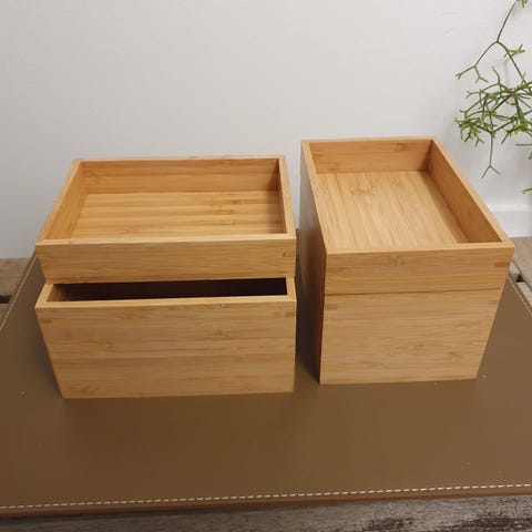 Kasserne er lavet i bambus og har et enkelt, naturligt look, der passer perfekt til opbevaring i stue, soveværelse, entré eller kontor. Kan stables og er både praktiske og dekorative.