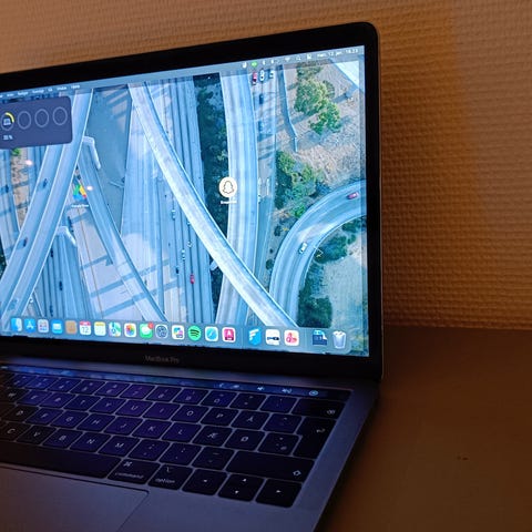 Apple MacBook laptop i farven space gray. Inkluderer oplader. Laptoppen har en skærm og et tastatur i fuld størrelse. Designet til brug med macOS operativsystem.