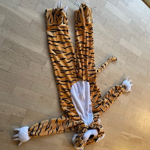 Fin kostume. Hul ved skidtet og lidt misfarvninger på knæene. Ellers fin stand. Kommer fra røg og dyrefrit hjem.