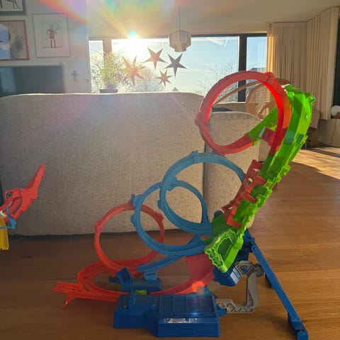 Hot Wheels legetøjsbane med loop, inkluderer en bil. Legetøjsbanen er designet til børn og består af plastmaterialer i farverne rød, gul og sort.