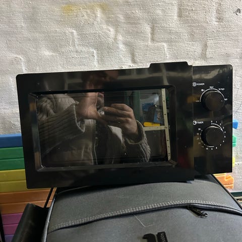 OBH mikrobølgeovn i hvid farve. Mikrobølgeovnen har et enkelt design med manuel betjening via drejeknapper. Indvendigt er der en roterende tallerken og et metalrist til opvarmning eller tilberedning af mad. Sender ikke.