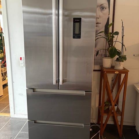 Bosch køle-fryseskab i rustfrit stål med separate køle- og frysedøre. Indretningen inkluderer flere hylder og skuffer. Det har en energieffektivitet klassificeret som A+.