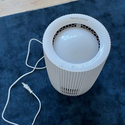Nordic Sense Luftrenser i hvid farve med cylindrisk design. Enhed til forbedring af luftkvaliteten i indendørs rum. Inkluderer tilslutningskabel.