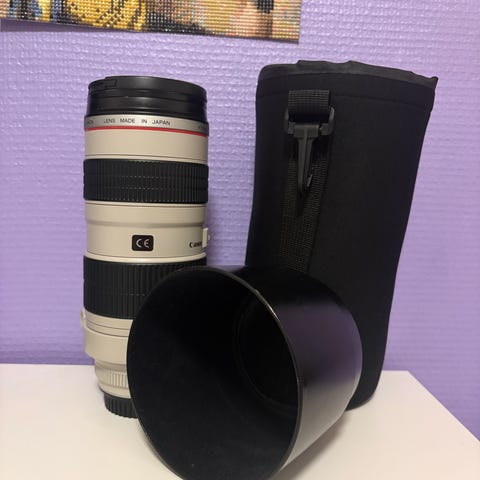 Canon EF 70-200mm f/2.8L USM. Brugt lidt, slid kan ses på billederne og er kun på ringen rundt om som kan skiftes:) Objektivet har en brændvidde på 70-200 mm og en maksimal blænde på f/2.8. Det er designet til Canon EF-mount kameraer og er velegnet til fotografering af sport, natur og portrætter.
