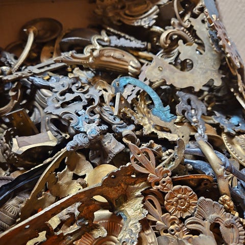 Miniature møbler, Messing dukkemøbler 4 stole og et bord 4 glas samt et lille og en kande - det hele i messing. Det er gamle ting. Meget dekorativt og unikt.