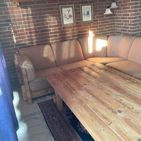 Flot 6 personers sofa. Bøgetræ med tremmeryg. Kostede 28.000 kr. i 1988. Sælges for højeste bud over 15.000 kr.