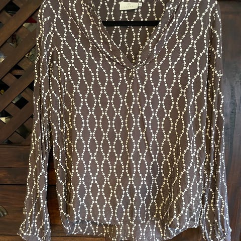 Skjorte med kinakrave og dyb V-hals. Skjorten åbnes/lukkes med 6 knapper, er længere bagpå end fortil.