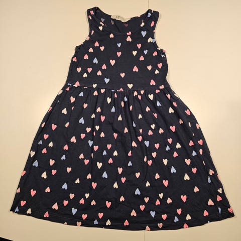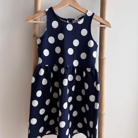 Kjole i A-snit uden ærmer med et skørt, der har en let puf/balloneffekt, da skørtet er syet på under brystet. Kjolen har en kort, kobberfarvet lynlås i nakken/toppen af ryggen.