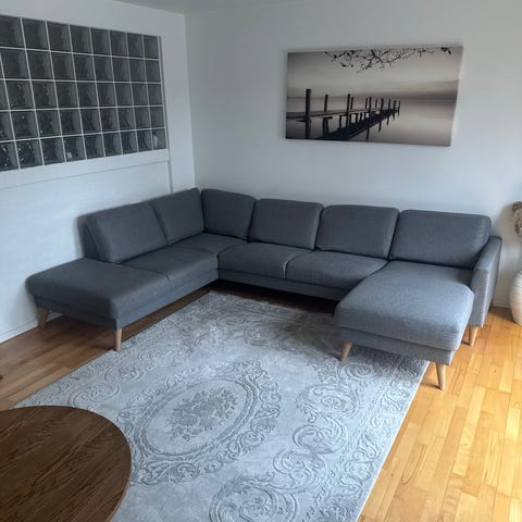 Sofaen har et hjørnearrangement og er velegnet til opholdsrum. Længden er 318 cm, og bredden 228cm.