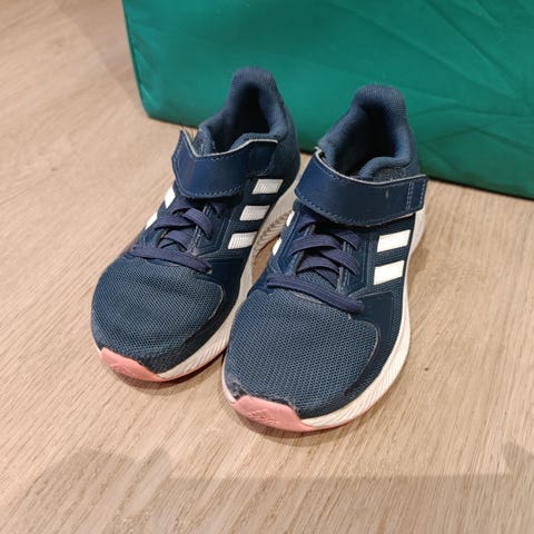 Adidas børnesko til piger i størrelse 24. Skoene er lilla med lyserøde og hvide detaljer. Materialet kombinerer tekstil og syntetiske materialer. Skoene har en lukning med velcro for bedre pasform.