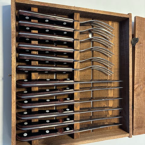 Sættet leveres i en flot, rå trææske, der matcher bestikkets robuste udtryk og gør det oplagt som gave. Du får 1 æske med 6 knive og 6 gafler.