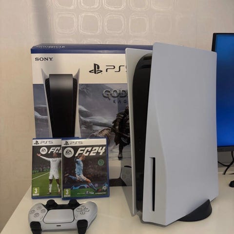 Playstation 5 spillekonsol i hvid og sort farve. Med controller og nødvendige kabler, er købt af en anden på dba så har ikke kvittering, men fungere godt og har ingen skader hverken kontroller eller PlayStationen