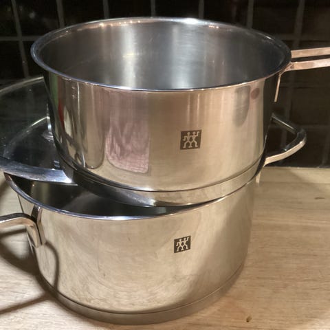 Zwilling gryde med låg og si, fremstillet i rustfrit stål. Gryden har to håndtag og en siindsats, som kan bruges til kogning og sigtning af madvarer. Passer til brug i køkkenet til forskellige madlavningsformål.