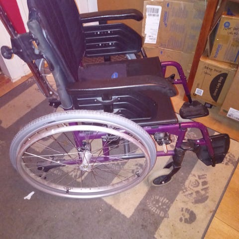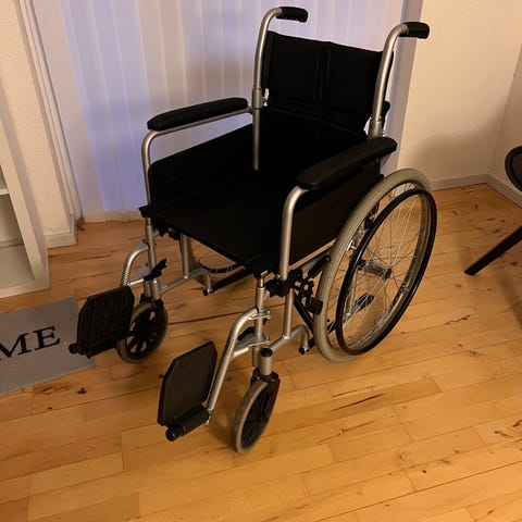 Invacare Alu Rehab kørestol i sort farve med stel af aluminium. Modellen er 2786 med mål 105 x 60 x 83 cm (L x B x H). Kørestolen har fodstøtter og armlæn.