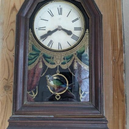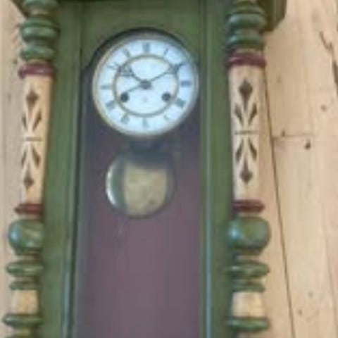 Antikt vægur med pendul i mørkt træ. Uret har en rund urskive med sorte tal og visere, og en glasdør foran pendulet. Velegnet til ophængning på væg.