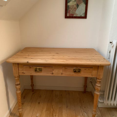 Sekretær skrivebord i træ med tre skuffer og skriveflade. Møblet har klassisk design med messinghåndtag og er velegnet til opbevaring og skrivearbejde.