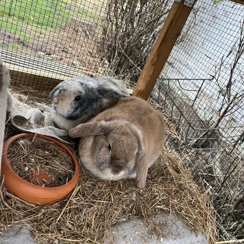 En mini-lop og en løvehoved, næsten 1 år gamle, og begge er hunner.