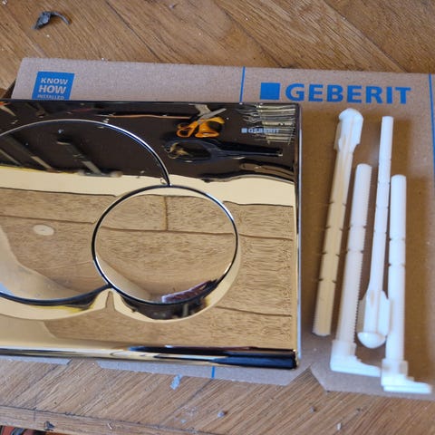 Geberit Typ 10 betjeningsplade i hvid med guldkant. Produktet leveres med installationsmanual og tilbehør. Designet til brug i badeværelser som betjeningsplade til toilet.